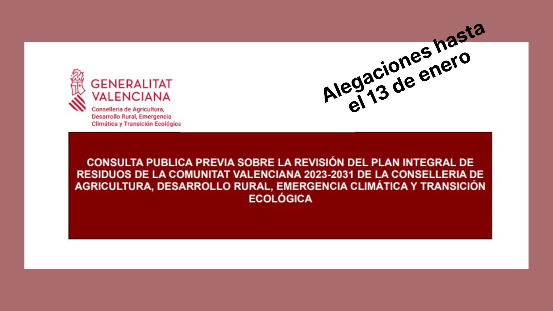 La Conselleria de Agricultura, Desarrollo Rural, Emergencia Climática y Transición Ecológica nos informa como representantes del CAPMA (Consejo Asesor y de Participación del Medio Ambiente de la CV), que ha iniciado la Consulta pública previa de la Revisión del Plan Integral de Residuos de la Comunitat Valenciana 2023-2031, cuyo documento se puede consultar adjunto a este correo electrónico.
