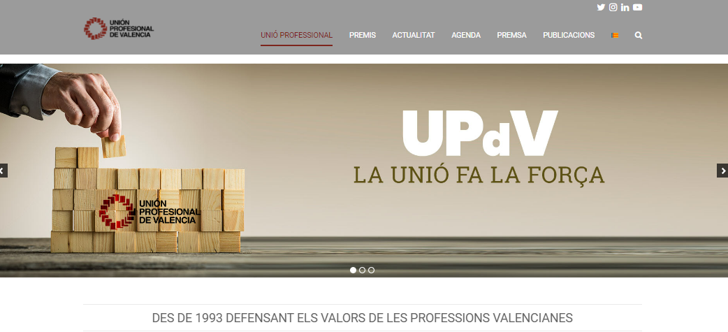 También con el fin de aproximarse al profesional colegiado se han estrenado recientemente los perfiles en LinkedIn e Instagram. El primero de ellos con clara vocación informativa en cuanto a las actividades de los colegios profesionales asociados como es habitual en la red social de profesionales y en Instagram con la idea de que destaque la esencia de los Premios a la Excelencia que en los próximos meses ocuparán importantes espacios comunicativos de Unión Profesional de Valencia.