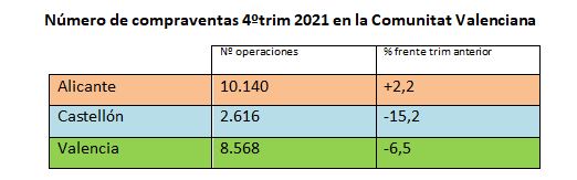 El número de compraventa de viviendas registrado en la Comunitat Valenciana durante el cuatro trimestre del año 2021 ha sido de 21.324, el segundo mayor resultado trimestral de los últimos trece años, solo superado por el trimestre precedente. De ahí que en el cuarto trimestre se aprecie un descenso del 3’8% en este apartado, aunque en comparación con el mismo período de 2020 se produce un crecimiento del 30%.