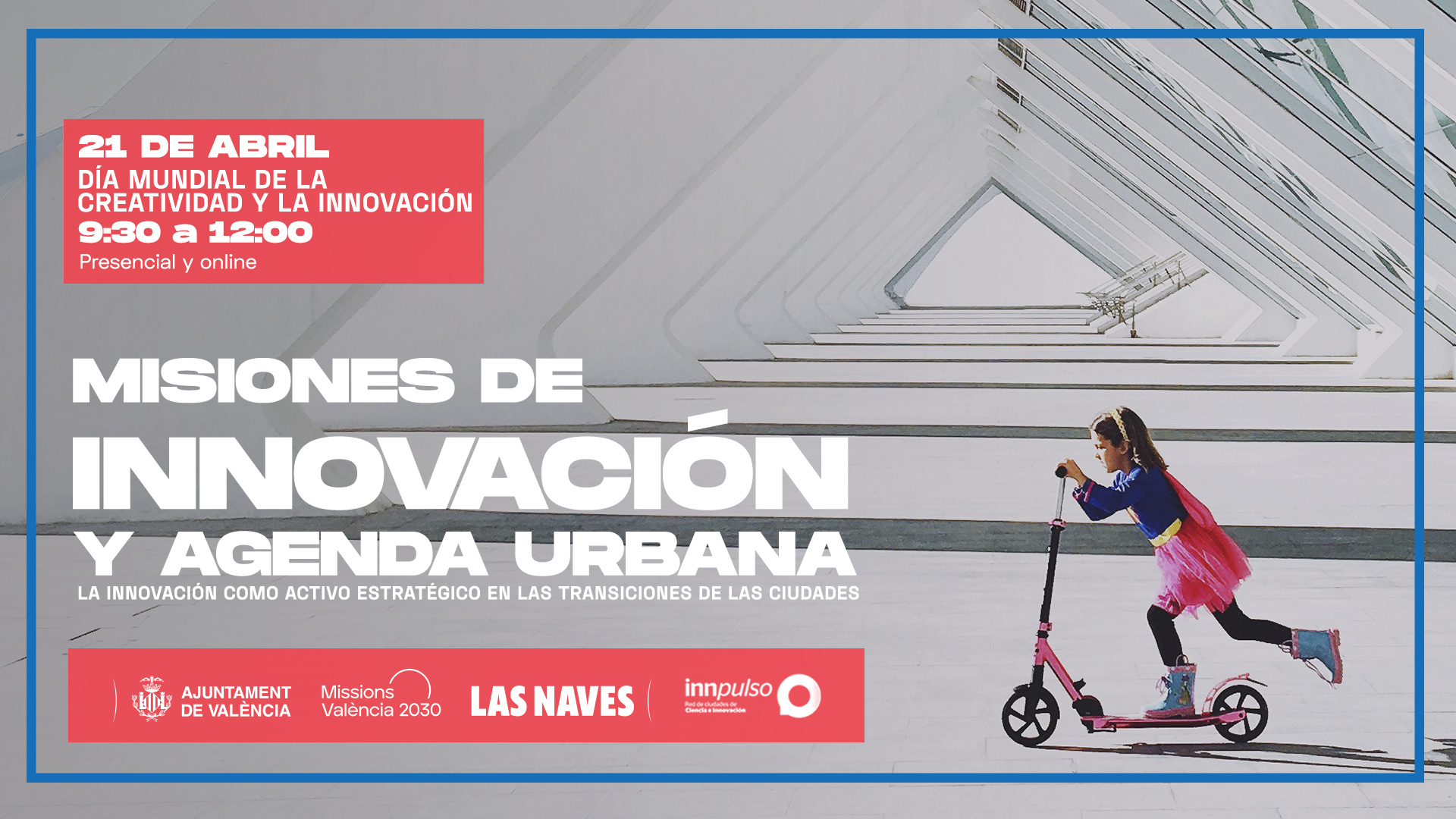El centro de innovación Las Naves, del Ayuntamiento de València, celebra el Día Mundial de la Creatividad y la Innovación con la jornada ‘Misiones de Innovación y Agenda Urbana’. En este evento se tratará la innovación como activo estratégico en las transiciones de las ciudades. - El objetivo es aprovechar la cita mundial de innovación para dar a conocer vía un evento inspirador cómo las ciudades están planificando sus transformaciones futuras a través de sus Agendas Urbanas y qué papel juega la innovación en las mismas.