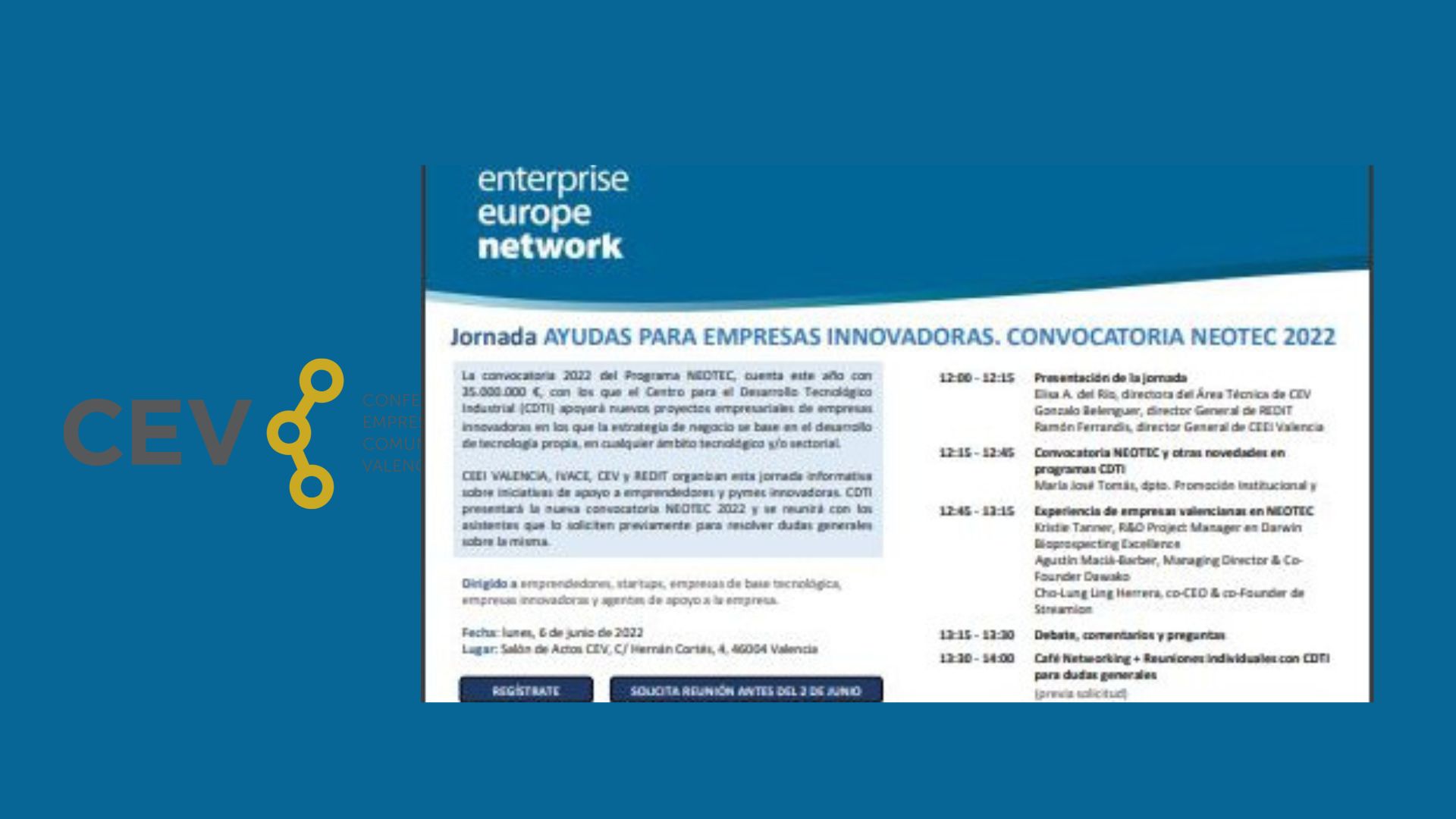 REDIT, CEEI Valencia e IVACE, en colaboración con la CEV, organizan en el marco de la Red EEN SEIMED, la Jornada “Ayudas para empresas innovadoras. CONVOCATORIA NEOTEC 2022”.