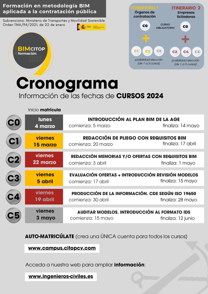 El programa formativo se compone de un CURSO C0 de carácter obligatorio para que conozcas el PLAN BIM del MITMA, así como la visión, misión y acciones estratégicas de la AGE, extrapolables a otras administraciones públicas. Se complementa con 5 CURSOS (C1, C2, C3, C4 y C5) de elección voluntaria y duración 30 horas cada uno, para que tú decidas según tus necesidades.
