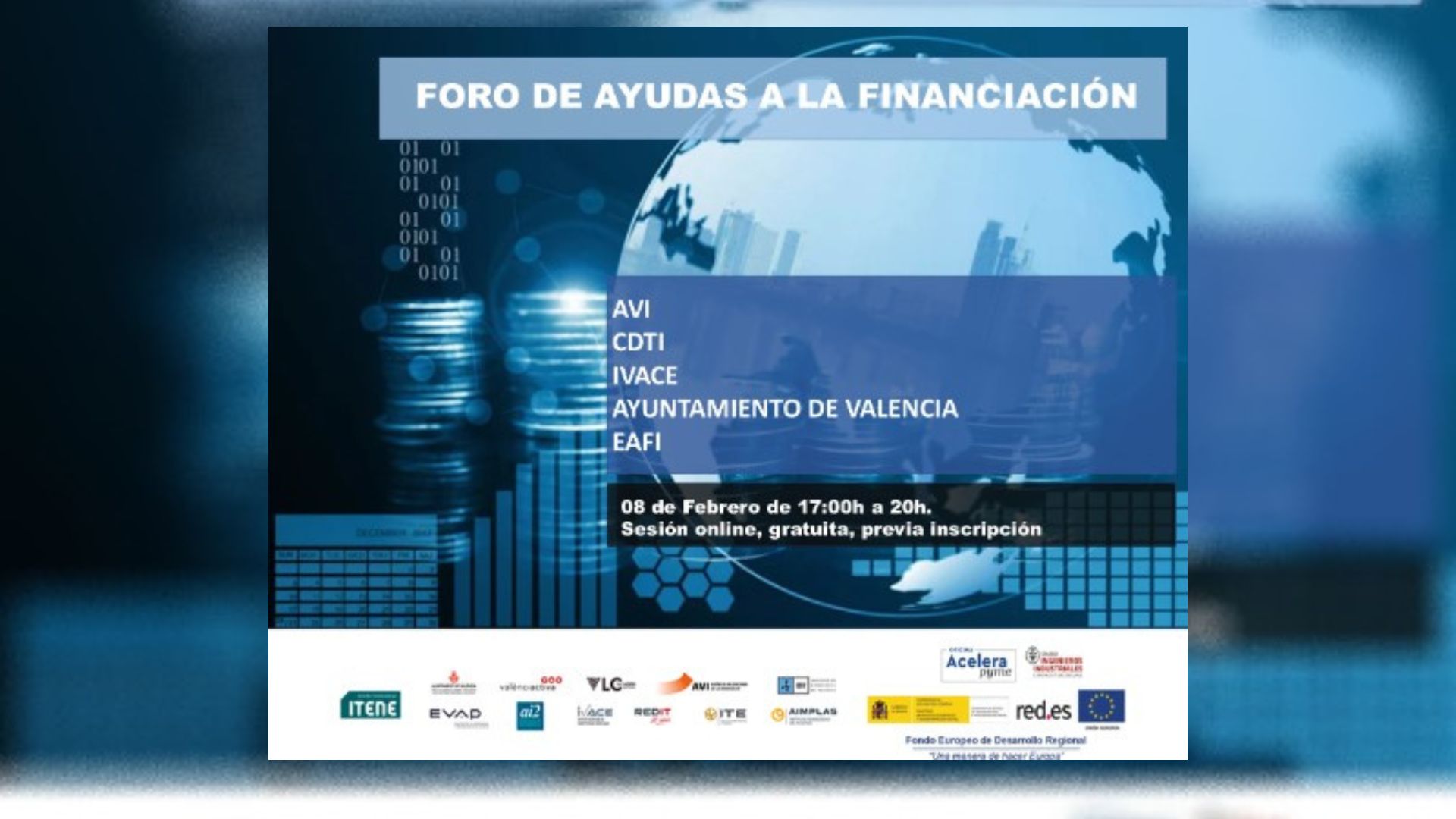 El próximo 8 de Febrero, de las 17:00h a las 20:00h en la sede de Valencia del COIICV, acoge el FORO DE AYUDAS  A LA FINANCIACIÓN de nuestra oficina Acelera Pyme