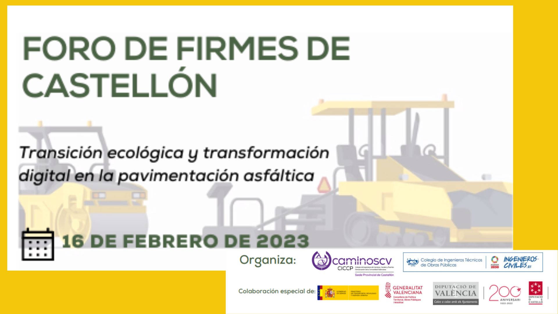 Foro de Firmes de Castellón, organizado por el Colegio de Caminos, Canales y Puertos de la CV y el Colegio de Ingenieros Técnicos de Obras Públicas de Castellón y Valencia bajo el lema Transición ecológica y transformación digital en la pavimentación asfáltica.