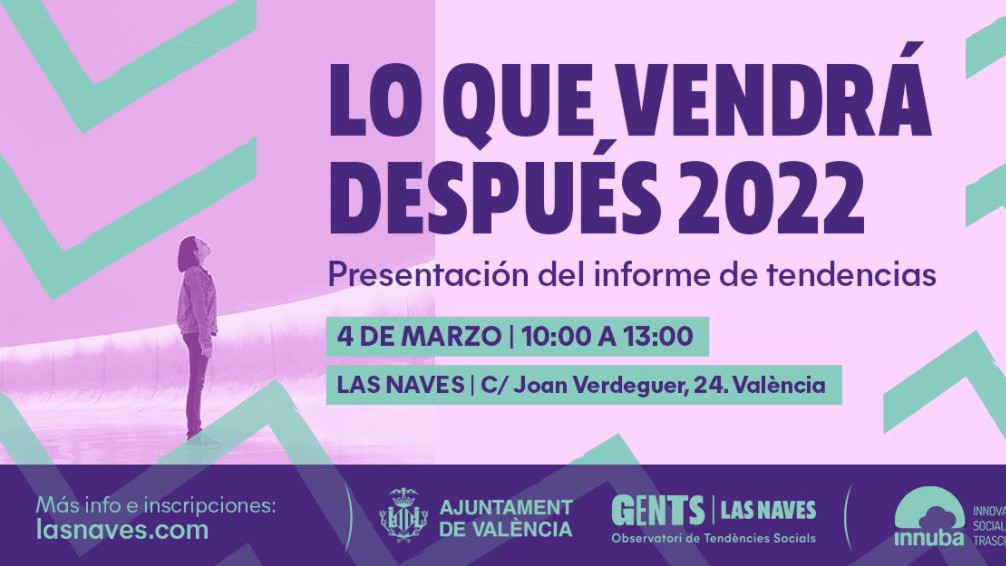 El próximo 4 de marzo a las 10:00h se presenta en el centro de innovación Las Naves, LQVD 2022. En el marco del Observatorio de Tendencias Sociales GENTS, la consultora de innovación social trascendente Innuba ofrecerá los resultados de «Lo que vendrá después», el estudio anual de tendencias que realiza de manera colaborativa y que recoge diferentes miradas para crear futuros positivos.