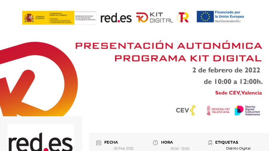La Conselleria de Innovación, Universidades, Ciencia y Sociedad Digital a través de Distrito Digital y Red.es organizan, en colaboración con la Confederación Empresarial de la Comunidad Valenciana (CEV) la presentación oficial en la Comunidad Valenciana del Programa Kit Digital para PYMES, dirigido a Agentes Digitalizadores del ecosistema de Distrito Digital y PYMES de la Comunidad Valenciana.