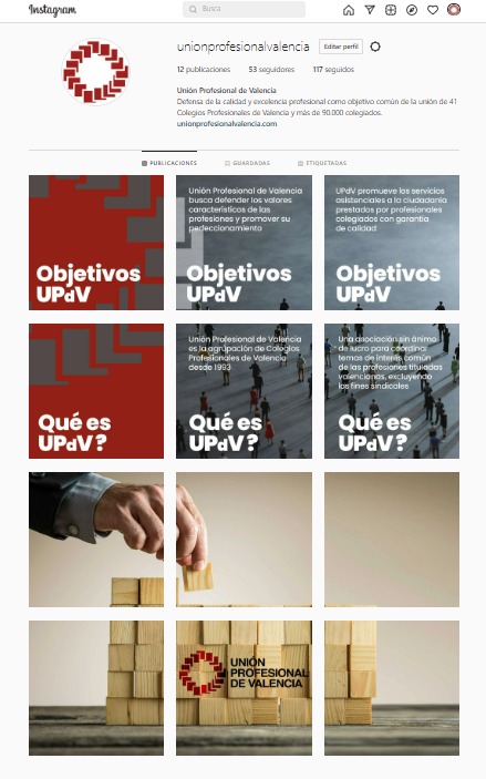 També amb la finalitat d’apropar-se al professional col·legiat s’han estrenat recentment els perfils en LinkedIn e Instagram. El primer d’ells amb clara vocació informativa quant a les activitats dels col·legis professionals associats com és habitual en la xarxa social de professionals i en Instagram amb la idea que destaque l’essència dels Premis a l’Excel·lència que en els pròxims mesos ocuparan importants espais comunicatius d’Unió Professional de València.