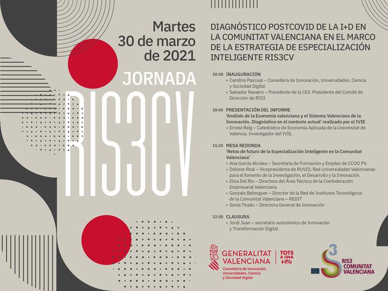 Diagnòstic Postcovid de la I+D en la Comunitat Valenciana en el Marc de l’Estratègia d’Especialització Intel·ligent RIS3CV, que tindrà lloc dimarts que ve dia 30 de març de 2021 a les 10:*30h. en streaming, amb una duració aproximada de 2 hores.