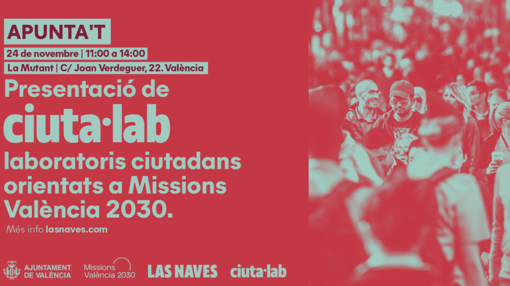 El 24 de novembre presentem ciuta·lab. Un projecte en construcció (perquè el volem construir amb tu). Un espai en el qual puguem ajuntar-nos a pensar els reptes que té la ciutat, i a buscar juntes solucions innovadores per a afrontar-los. Un lloc en el qual aprendre a participar, a experimentar i a produir juntes eixes solucions. Un espai d’investigació i innovació en el qual reunir persones diverses, amb experiències i sabers diferents. Un espai per a “disoñar” la ciutat que volem i començar a fer-la realitat.